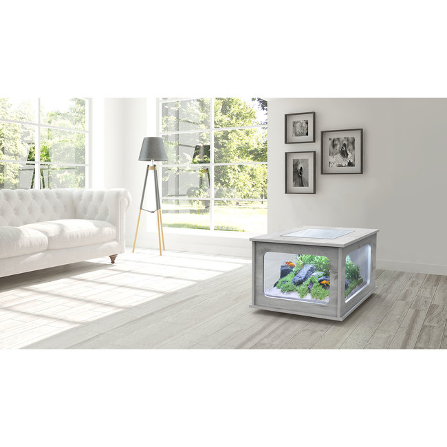 Aquatable 100x63cm moyen modèle. Complètement équipée avec une lampe LED 2.0 et un filtre interne BIOBOX® , chauffage et pompe à air. D'une capacité de 177 litres. Couleur Blanc. Créez un décor aquatique fascinant dans votre salon grâce à cette table aquarium.